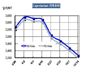 카프로락탐 가격이 10월13일 CFR China 톤당 3345달러로 55달러 급락했다.