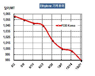 에틸렌 가격은 10월21일 FOB Korea 톤당 985달러로 16달러 하락했다.
