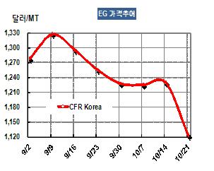 MEG 가격은 10월21일 CFR China 톤당 1121달러로 108달러 폭락했다.