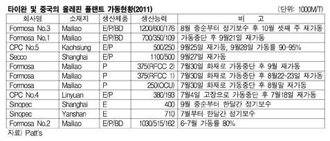 표, 그래프: < 타이완 및 중국의 올레핀 플랜트 가동현황(2011) > <화학저널 2011/10/24> |