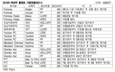 표, 그래프: < 아시아 PE/PP 플랜트 가동현황(2011) > <화학저널 2011/10/25> |