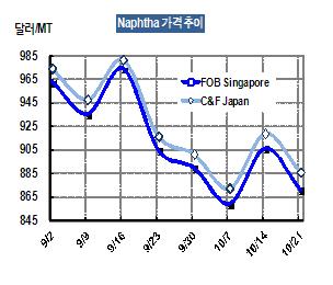 나프타 가격은 10월21일 CFR Japan 톤당 886달러로 33달러 하락했다.