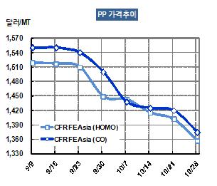 PP 가격은 10월24일 CFR FE Asia 톤당 1357달러로 45달러 폭락했다.