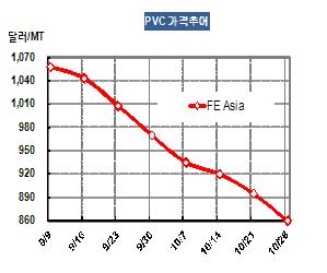 PVC 가격은 10월24일 CFR FE Asia 톤당 860달러로 35달러 급락했다.