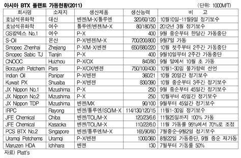 Indian Oil은 Panipat 소재 P-X 36만톤, 벤젠 2만1000톤 플랜트를 10월 20일간, Kuwait PX는 Shuaiba 소재 P-X 83만톤, 벤젠 39만톤 플랜트를 10월 중순부터 3주간 정기보수할 예정이다. 표, 그래프: < 아시아 BTX 플랜트 가동현황(2011) > <화학저널 2011/11/01> |