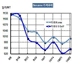 벤젠 가격은 10월26일 FOB Korea 톤당 1001달러로 27달러 상승했다.