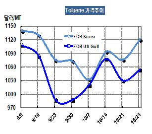 톨루엔 가격은 10월26일 FOB Korea 톤당 1121달러로 37달러 상승했다.