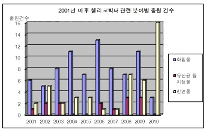 표, 그래프: < 2001년 이후 헬리코박터 관련 분야별 출원 건수 > <화학저널 2011/11/03> |