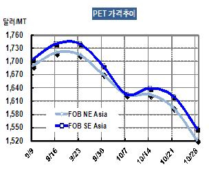 동북아시아 생산기업들은 원료코스트 하락으로 10월25일 FOB NE Asia 톤당 1550달러를 제안했으나 구매기업은 계속 1500달러 이하를 요구한 것으로 알려졌다. 표, 그래프: < PET 가격추이 > <화학저널 2011/11/04> |