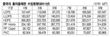 7ㆍ8월 급증 후 9월 다시 줄어 … PVC는 증가 지속 9만톤 상회