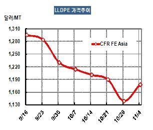 LLDPE 가격은 11월2일 CFR FE Asia 톤당 1178달러로 39달러 급등했다.