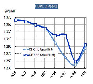 동북아시아 HDPE 가격은 Injection 및 Blow-Molding 그레이드가 CFR FE Asia 톤당 1285달러, Film 그레이드는 1295달러, Yarn 그레이드는 1330달러를 형성했다. 표, 그래프: < HDPE 가격추이 > <화학저널 2011/11/07> |