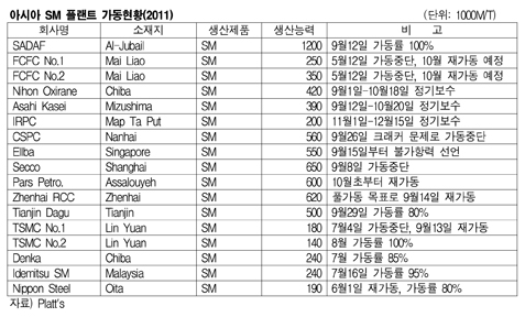 특히, 9월 정기보수에 들어갔던 플랜트들도 정기보수를 마치면서 우려의 목소리가 더욱 커지고 있다. 표, 그래프: < 아시아 SM 플랜트 가동현황(2011) > <화학저널 2011/11/07> |