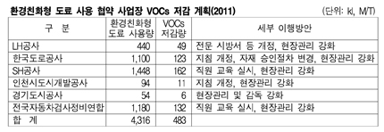계획에 따라 도장 작업지침 개정 및 현장 감독강화 등을 통해 환경친화형 도료 사용을 위한 유통 환경을 조성하고, 현장 담당자 교육을 통해 도료 사용 관리의 전문성을 제고한다. 표, 그래프: < 환경친화형 도료 사용 협약 사업장 VOCs 저감 계획(2011) > <화학저널 2011/11/09> |