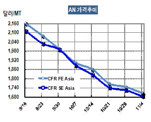 AN 가격은 11월1일 CFR FE Asia 톤당 1705달러로 40달러 폭락했다.