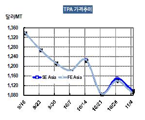 폴리에스터 생산/판매 비율은 지난주와 비슷한 70-80% 수준을 유지했으며 수요부진이 계속되고 있다. 표, 그래프: < TPA 가격추이 > <화학저널 2011/11/11> |