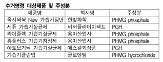 위해성이 확인됨에 따라 6종의 가습기살균제에 대해 강제 수거 명령이 내려지고 모든 종류의 가습기살균제가 의약외품으로 지정 및 관리되며, 다른 가정용 화학제품에 대해서도 안전성 검증체계를 가동할 방침이다. 표, 그래프: < 수거명령 대상제품 및 주성분 > <화학저널 2011/11/11> |