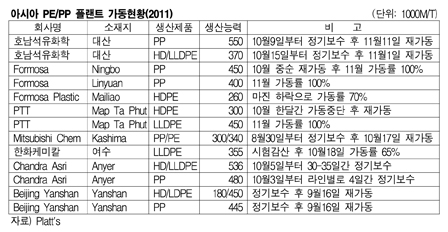 한편, 인도네시아의 Chandra Asri는 Anyer 소재 HDPE/LLDPE 53만6000톤 플랜트를 10월5일부터 정기보수에 들어가 11월10일이면 재가동에 들어간 것으로 알려졌다. 표, 그래프: < 아시아 PE/PP 플랜트 가동현황(2011) > <화학저널 2011/11/11> |