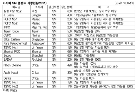 표, 그래프: < 아시아 SM 플랜트 가동현황(2011) > <화학저널 2011/11/14> |