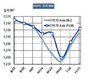 HDPE 가격은 11월9일 CFR FE Asia 톤당 1325달러로 40달러 급등했다.