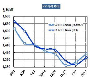 PP 가격은 11월9일 CFR FE Asia 톤당 1406달러로 34달러 급등했다.