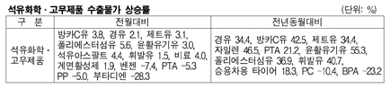 석유화학제품은 PP(Polypropylene)가 5.0%, 부타디엔(Butadiene)이 28.3%, PTA(Purified Terephthalic Acid)가 5.3% 하락한 반면, 방카C유는 3.8%, 폴리에스터(Polyester) 섬유가 5.6%, 휘발유 1.5% 상승했다. 표, 그래프: < 석유화학․고무제품 수출물가 상승률 > <화학저널 2011/11/15> |