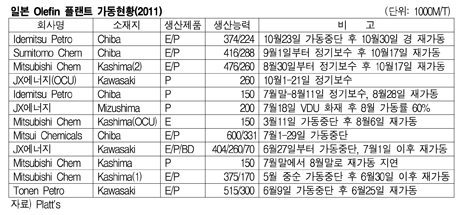 11월 들어 일본 올레핀(Olefin) 플랜트들이 대체적으로 양호한 가동률을 나타내고 있어 공급과잉에 대한 우려가 높아지고 있다.