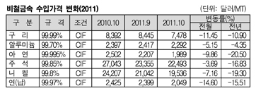 아연은 세계적인 수요 감소 및 비철금속의 약세 영향으로 9.9% 하락해 톤당 1989달러를 형성했다. 표, 그래프: < 비철금속 수입가격 변화(2011) > <화학저널 2011/11/17> |