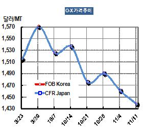 O-X 가격은 11월11일 FOB Korea 톤당 1438달러로 22달러 하락했다.