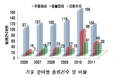 자동으로 주행하고, 스스로 주차하는 등 미래 자동차 관련기술들이 현실화되고 있다. 국내 출원인으로는 현대ㆍ기아자동차와 같은 완성자동차 생산기업이 374건으로 전체의 40%를 차지하고 있고, 만도와 같은 부품 관련 중소기업이 304건으로 33%, 개인 및 대학ㆍ연구기관이 75건으로 27%를 나타냈다. 한편, 주행 제어와 충돌 회피 분야는 완성자동차 생산기업이, 자동 주차 분야는 부품기업 및 중소기업의 출원 비율이 높은 것으로 나타났다. 그래프, 도표< 기술 분야별 출원건수 및 비율 > <화학저널 2011/11/23> |