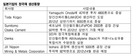 표, 그래프: < 일본기업의 정극재 생산동향 > <화학저널 2011/11/24> |