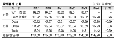 11월24일 0.59달러 떨어져 … Brent는 0.76달러 올라 107.78달러