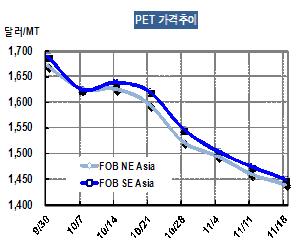 PET Bottle 칩 가격은 11월16일 FOB NE Asia 톤당 1440달러로 20달러 하락했다.