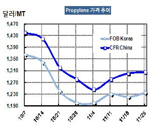프로필렌 가격은 11월25일 FOB Korea 톤당 1235달러로 15달러 상승했다.