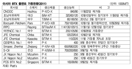 표, 그래프: < 아시아 BTX 플랜트 가동현황(2011) > <화학저널 2011/11/30> |