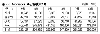 표, 그래프: < 중국의 Aromatics 수입현황(2011) > <화학저널 2011/12/02> |