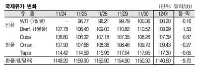 12월1일 0.87달러 떨어져 … Brent 1.53달러 하락에 WTI 100달러 유지