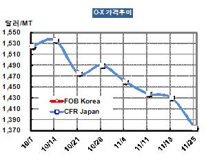 O-X 가격은 11월25일 FOB Korea 톤당 1375달러로 55달러 폭락했다.