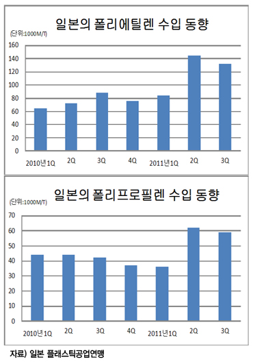 일본 경제산업성의 수입통계에 따르면, 2011년 1-6월 에틸렌(Ethylene) 환산 수입량은 38만3300톤으로 전년동기대비 39.5% 증가했고 7-9월에도 18만7962톤으로 39.4% 신장했다.