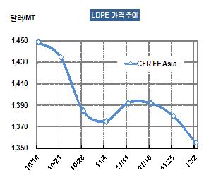 LDPE 가격은 11월30일 CFR FE Asia 톤당 1355달러로 25달러 하락했다.