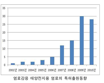 식물의 광합성원리를 응용한 염료감응 태양전지용 염료가 주목받고 있다. 염료감응 태양전지는 태양빛을 흡수한 염료가 산화환원 반응에 의해 전력에너지를 생산하는 것으로 광합성원리를 응용한 것이며, 상용화된 폴리실리콘(Polysilicon) 기반의 태양전지에 비해 생산비용을 최대 1/5로 낮출 수 있어 태양광산업의 새로운 전환점이 될 것으로 기대되고 있다. 표, 그래프: < 염료감응 태양전지용 염료의 특허출원동향 > <화학저널 2011/12/07> |