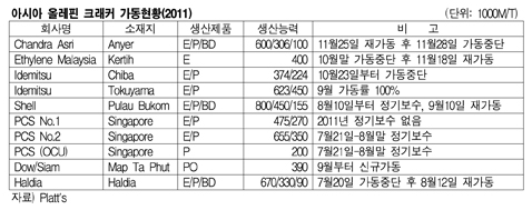 아시아 에틸렌 시세는 다운스트림 시장 부진으로 스팀 크래커의 가동률이 감축한 영향으로 공급이 줄어들어 1100달러에 육박했다. 표, 그래프: < 아시아 올레핀 크래커 가동현황(2011) > <화학저널 2011/12/08> |