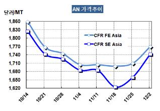 AN 가격은 11월29일 CFR FE Asia 톤당 1770달러로 60달러 급등했다.