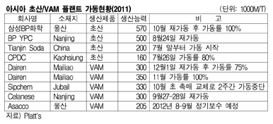 한편, Dairen의 Mailiao 소재 VAM 35만톤 플랜트는 가동률 100%를 기록하고 있으며, Celanese의 Nanjing 소재 VAM 30만톤 플랜트도 9월 재가동 후 정상가동하고 있다. 표, 그래프: < 아시아 초산/VAM 플랜트 가동현황(2011) > <화학저널 2011/12/09> |