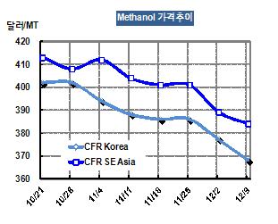 메탄올 가격은 12월9일 CFR Korea 톤당 368달러로 9달러 하락했다.