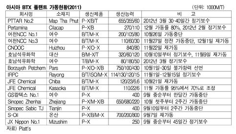 표, 그래프: < 아시아 BTX 플랜트 가동현황(2011) >
