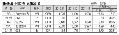 합섬원료 11월 수입가격이 10월에 이어 하락세를 지속했다.