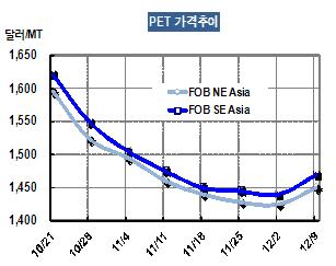 PET Bottle 칩 가격이 12월7일 FOB NE Asia 톤당 1450달러로 25달러 상승했다.