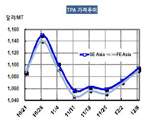 중국 남부지방 생산기업 관계자는 “폴리에스터 생산기업들이 신정 연휴에 대비한 구매를 마치면 수요가 다시 감소할 것”이라고 전망했다. 표, 그래프: < TPA 가격추이 > <화학저널 2011/12/16> |