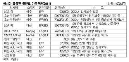 여천NCC No.1 크래커는 6월에도 이상으로 6월25-26일 가동을 중단한 후 7월 초부터 현재까지 100% 가동하고 있다. 표, 그래프: < 아시아 올레핀 플랜트 가동현황(2011) > <화학저널 2011/12/16> |